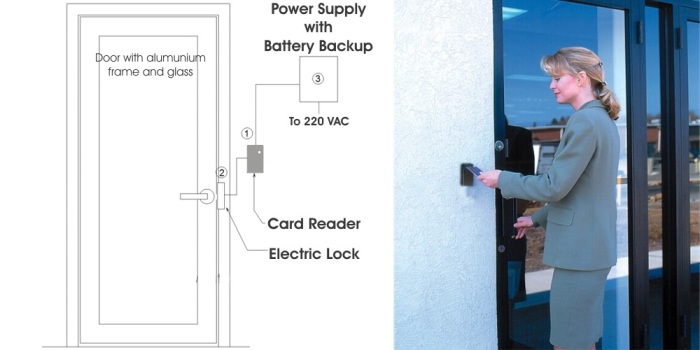 If the door using small frame, alumunium frame with glass, glass door, sliding door or anykind of door that can't use hotel door lock, you can use our Deluns Access Control Lock, which is separate card reader, electronic lock and power supply. And integrated with Lock Management System Software